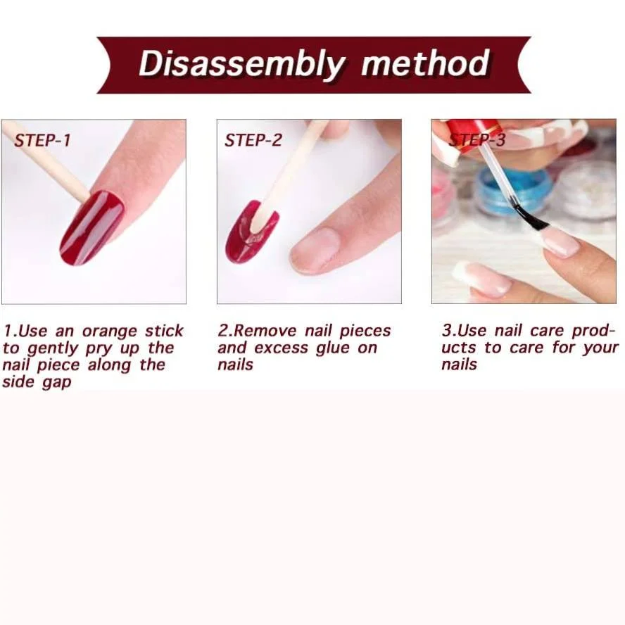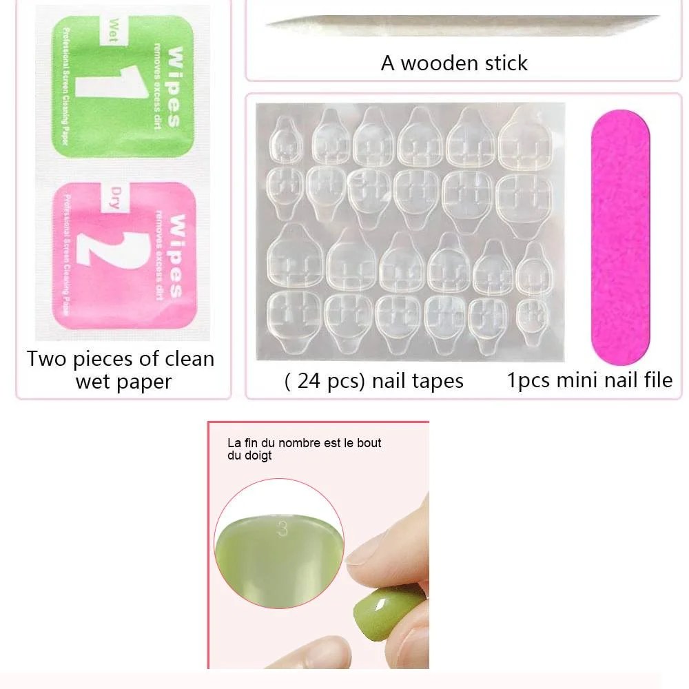 Emballage inclus: Les pointes de faux ongles comprennent un ensemble de 24 pointes de faux ongles, des onglets adhésifs pour ongles 24pcs, une mini lime à ongles, un bâton en bois et du coton propre pour les ongles.
