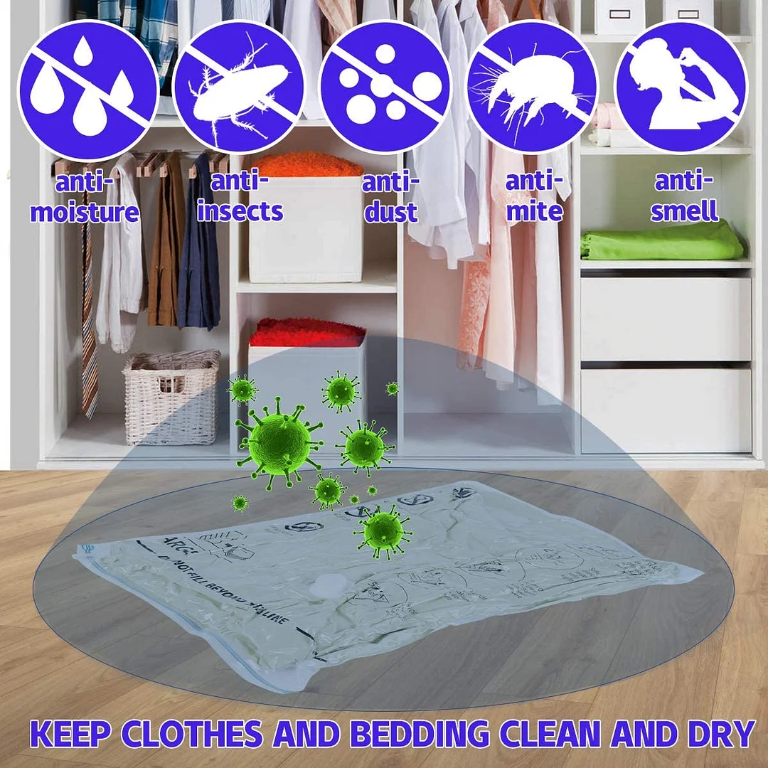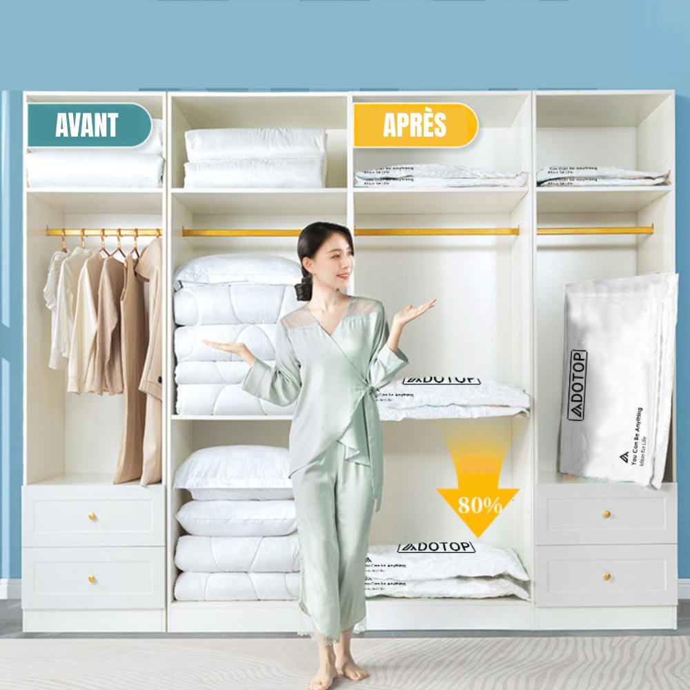 - Nos sacs vetement sous vide sous vide pour vêtements utilisent une VALVE ANTI-FUITE brevetée et une DOUBLE FERMETURE ÉCLAIR pour aider à protéger vos articles. Ces sacs de mise sous vide vous aideront également à éviter les odeurs indésirables et la poussière et à conserver vos vêtements protégés et stockés en toute sécurité jusqu'à ce que vous en ayez besoin. Convient à tous les types d'aspirateursCREER 80% D'ESPACE SUPPLEMENTAIRE - Ces sacs aspiration sous vide pour vêtements permettent une compression étonnante pouvant atteindre 80% de la taille originale de l'article (ce qui vous donne 4 fois plus d'espace). En plus du rangement des vêtements, ces sacs de rangement peuvent être utilisés pour emballer les couettes, les rideaux, la literie, les serviettes, les coussins, les peluches et plus encore pour désencombrer la maison et être plus organisé !- Ils fonctionnent avec n'importe quel aspirateur standard / Hoover ; réduisez vos sacs en quelques secondes.